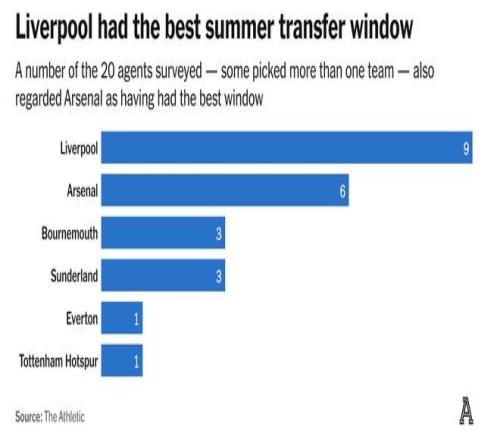 阿森納實(shí)際上以六票位居第二。利物浦花費(fèi)4.18億英鎊的采購(gòu)狂潮(通過(guò)價(jià)值1.9億英鎊的球員銷售抵消)為他們贏得了贊譽(yù)和榜首位置,盡管幾位新援尚未產(chǎn)生化學(xué)反應(yīng)。